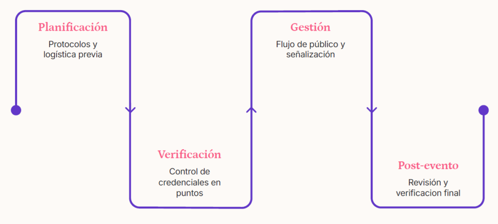 Nuestro equipo está entrenado para detectar situaciones de riesgo, gestionar acreditaciones de múltiples tipos, coordinar accesos VIP y backstage, y mantener la calma en momentos de alta presión.